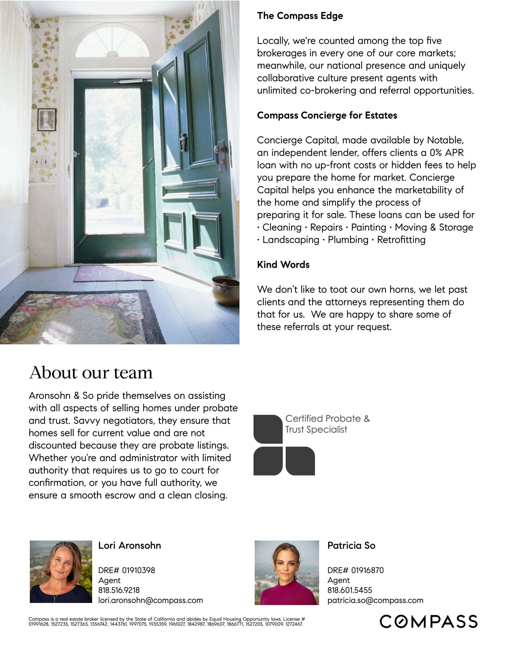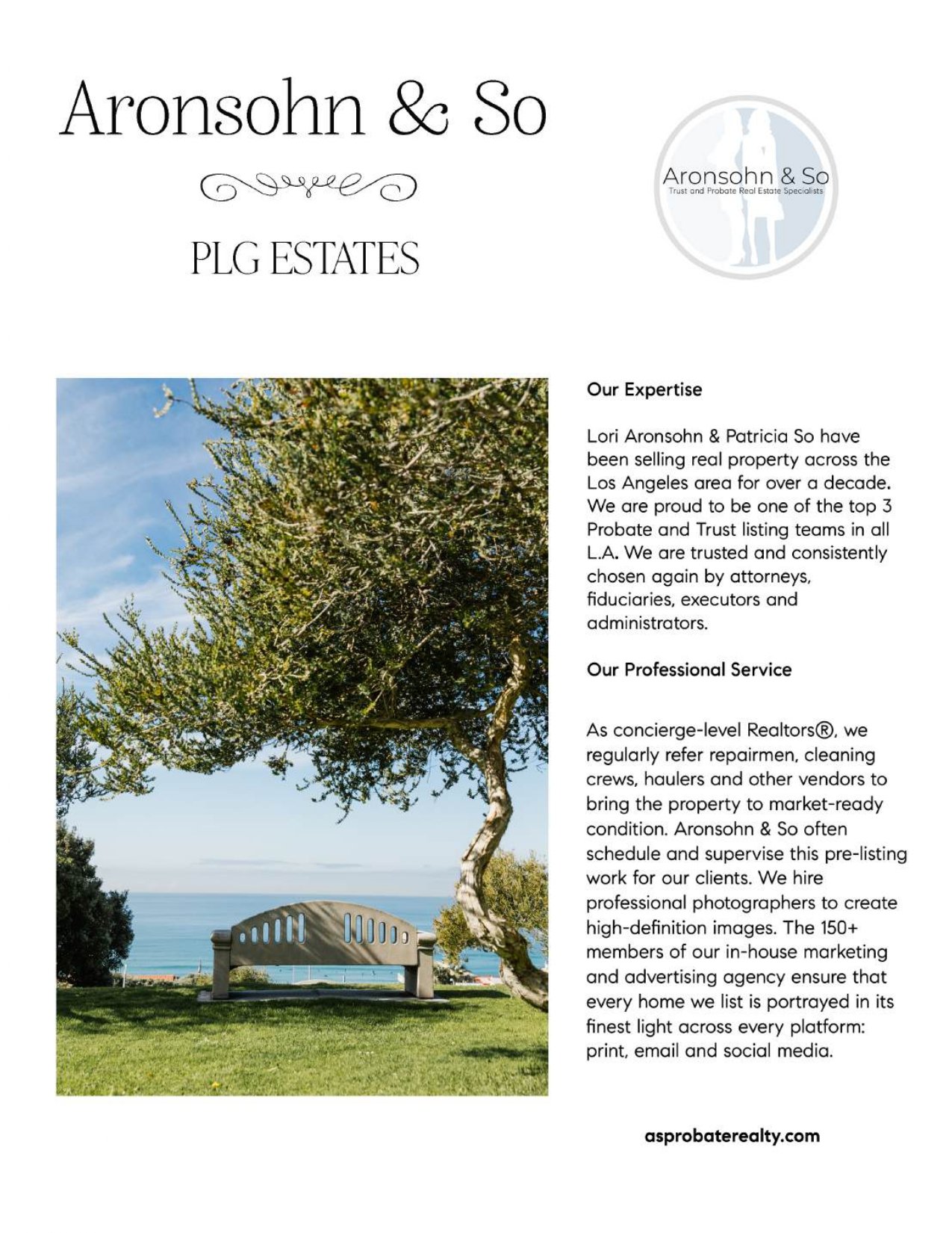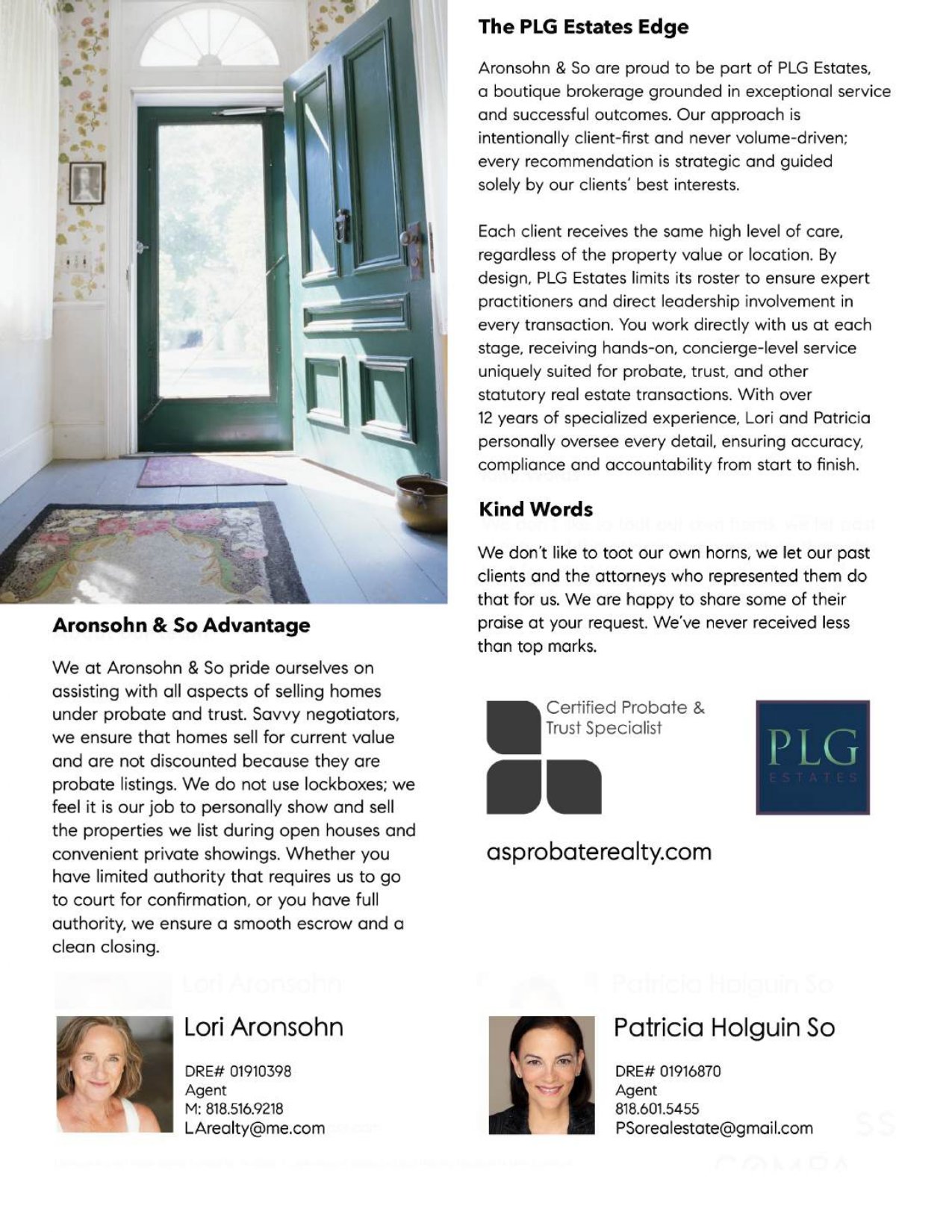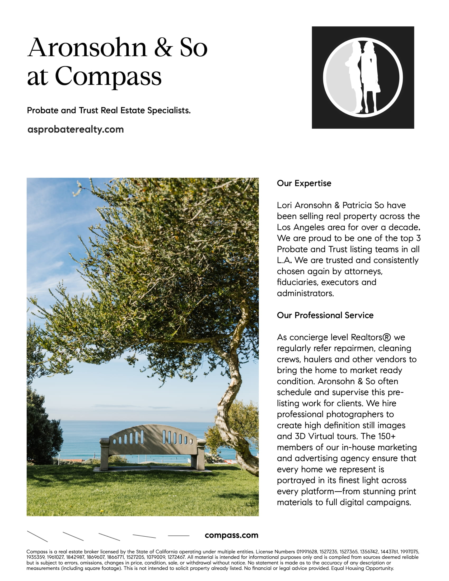 Lori Aronsohn & Patricia So have been selling real property across the Los Angeles area for over a decade. We are proud to be one of the top 3 Probate and Trust listing teams in all L.A. We are trusted and consistently chosen again by attorneys, fiduciaries, executors and administrators.
